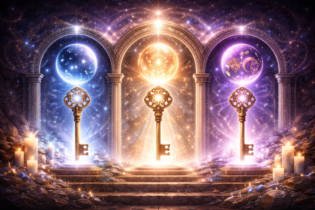 Limpeza e alinhamento energético, ativação das chaves de reprogramação e transmutação, fechamento do campo com técnicas apométricas, programação de proteção e elevação de frequência.